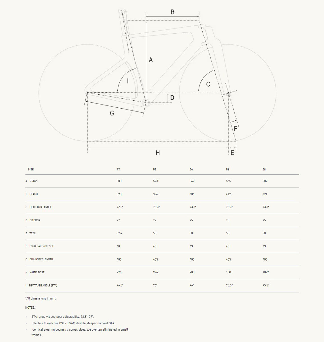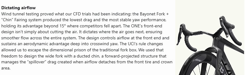 Aerodynamics was only half the mission. The modern racer’s position has shifted, using narrower bars, more forward saddles, shorter cranks, all of which pushes the rider’s weight further over the front wheel. Without carefully focused geometry, this can upset handling balance and increase crash risk. The ONE’s geometry was designed to accommodate these WorldTour positions without compromise. By decoupling the handlebar mount from the steering axis, we can give riders the extreme reach they want without resorting to unstable, overlong stems. We adjusted bottom bracket drop to compensate for the raised center of gravity from shorter cranks and larger tires, preserving stability and keeping front/rear weight balance in check. Even in the smallest sizes, the ONE keeps identical steering geometry to the largest frames, a rarity in high-performance road bikes.